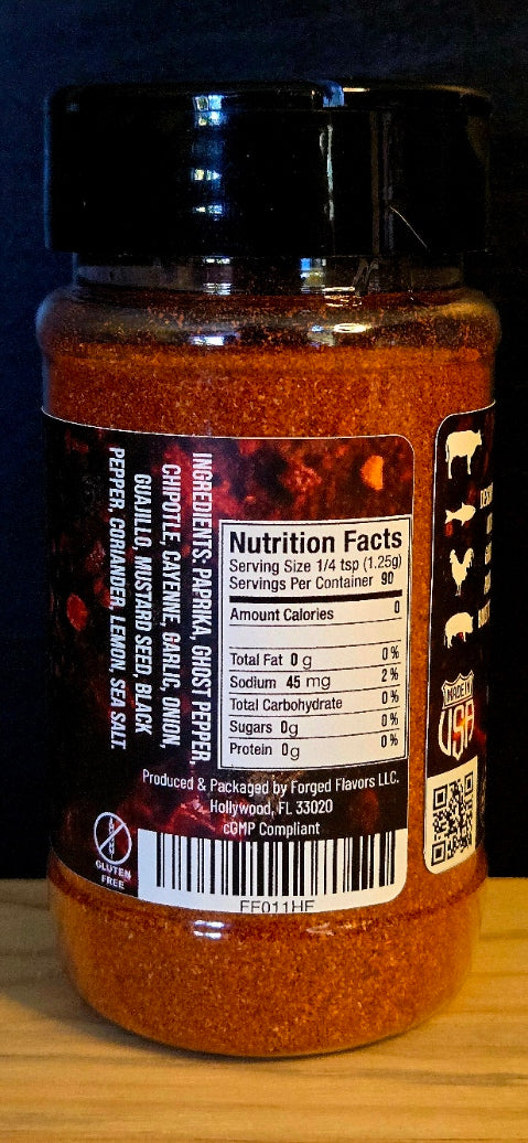 Ingredients: Paprika, Chipotle Powder, Cayenne Pepper, Real Ghost Pepper, Garlic, Onion, Guajillo Pepper, Mustard, Black Pepper, Coriander, Lemon, Sea Salt.