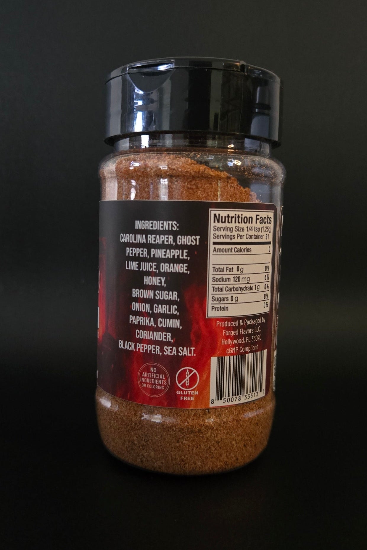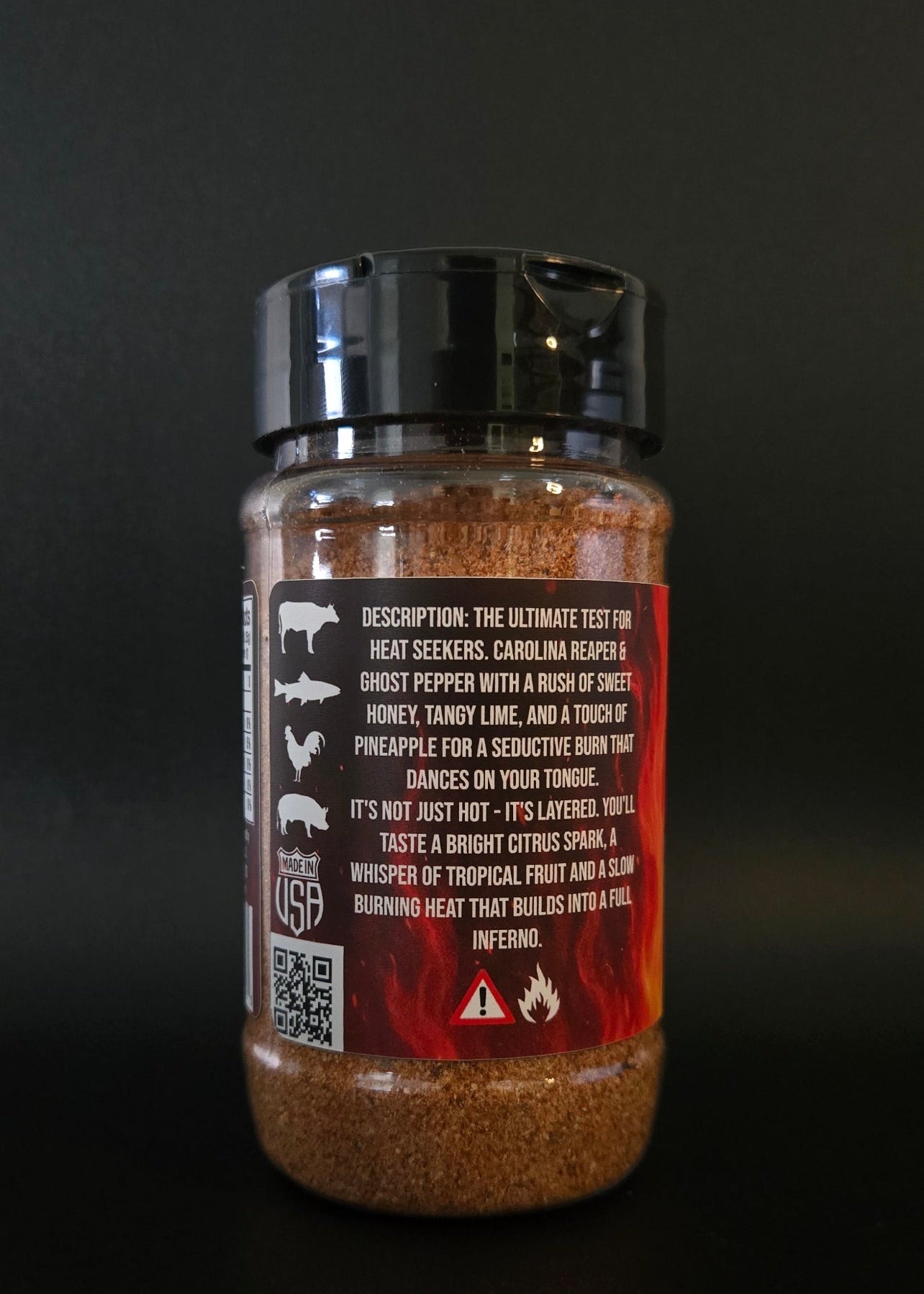 Inferno Pit is not for the faint of heart. This blend ignites your taste buds with a calculated explosion of Carolina Reaper and Ghost Pepper, two of the world’s hottest chiles. But beneath the fury lies balance — a subtle layer of honey and brown sugar brings a smoky sweetness that softens the edges, while pineapple and lime powder add a vibrant, fruity kick that keeps the heat alive without overpowering flavor.