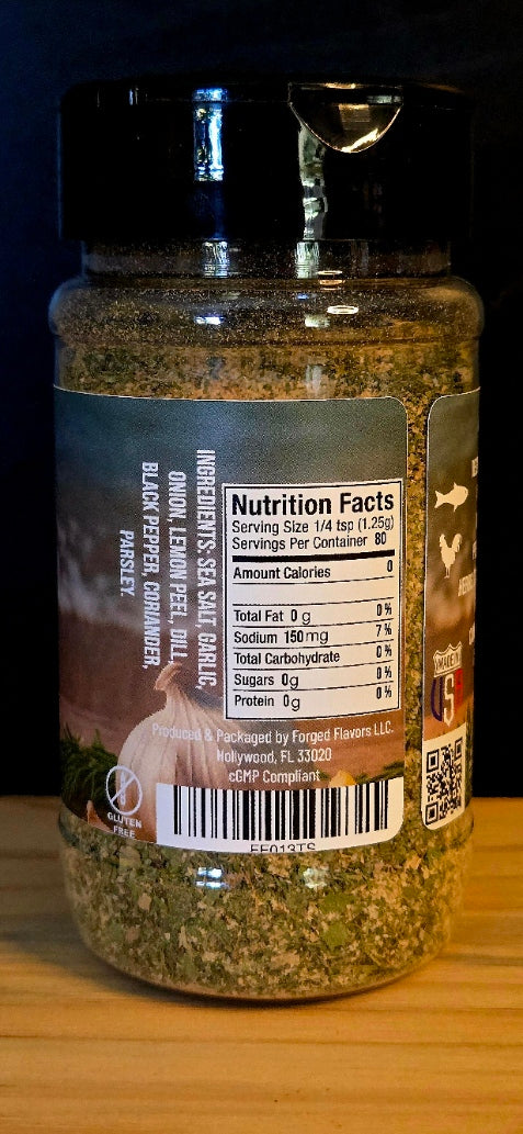 Ingredients: Sea Salt, Garlic, Onion, Lemon Peel, Dill, Black Pepper, Coriander, Parsley.